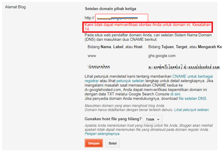 - Kembali ke Pengaturan Blogspot, kemudian klik Simpan. Apabila masih belum bisa disimpan, artinya perubahan pada DNS domain sebelumnya masih propagate dan belum bisa diverifikasi otorisasinya oleh google sehingga ditunggu beberapa saat dan klik Simpan kembali