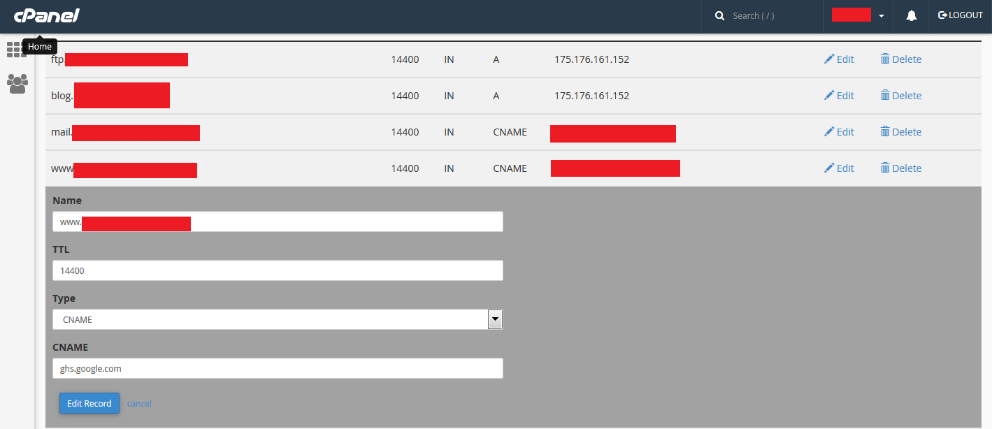 - Edit record www (atau subdomain, jika anda cus) yang diarahkan ke ghs.google.com dan tambahkan dengan CNAME yang telah didapatkan sebelumnya.