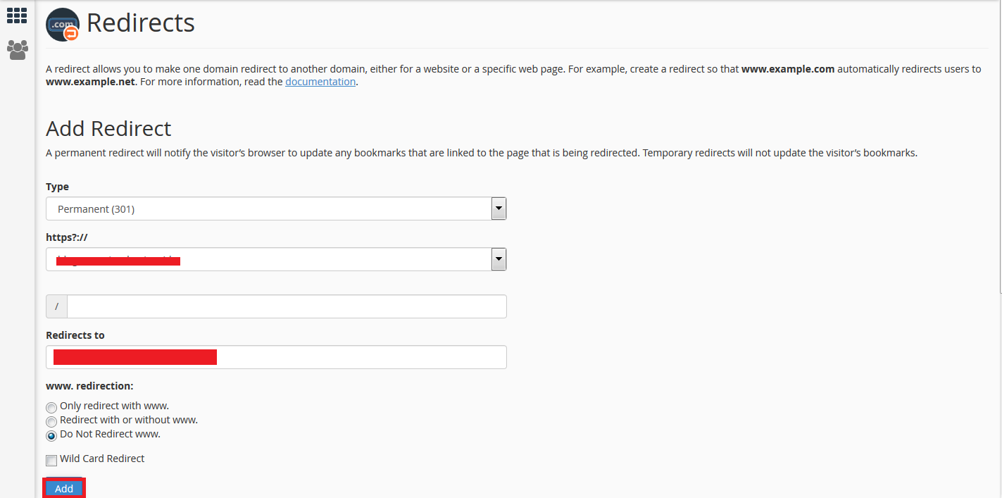 - selanjutnya, masuk ke menu Redirects untuk mengahlihkan saat akses domain dari www.example.com ke example.com atau sebaliknya