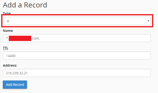 - Selanjutnya tambahkan A records dengan memilih dari type Cname menjadi A