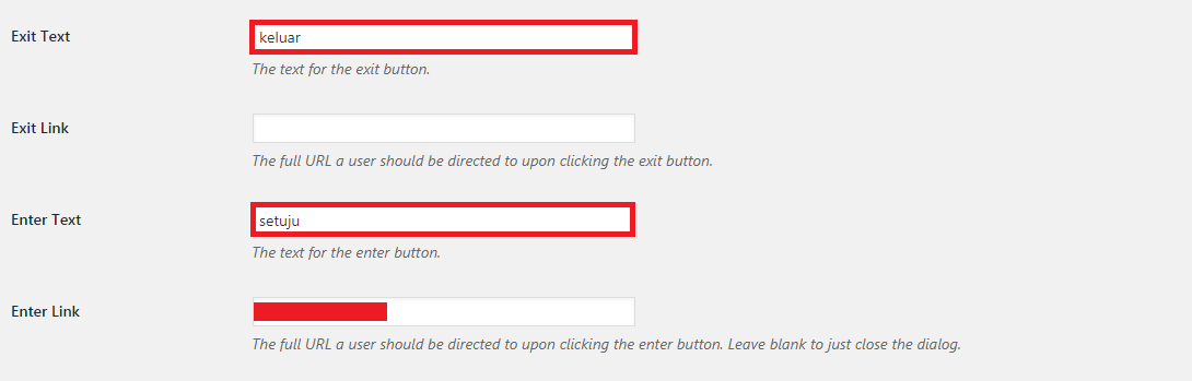 - Terdapat dua pengaturan tombol, yaitu tombol keluar dan tombol persetujuan untuk mengakses konten. Tombol keluar dapat diisi dengan URL tujuan yang Anda inginkan. Jika Anda kosongkan, secara otomatis Anda akan diarahkan ke Google.