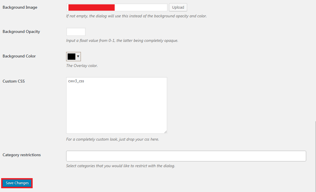 - General Settings: pengaturan untuk menampilkan pop up peringatan konten pada kategori, halaman, dan masa aktif cookie dari pop up yang ditampilkan dalam hitungan hari.