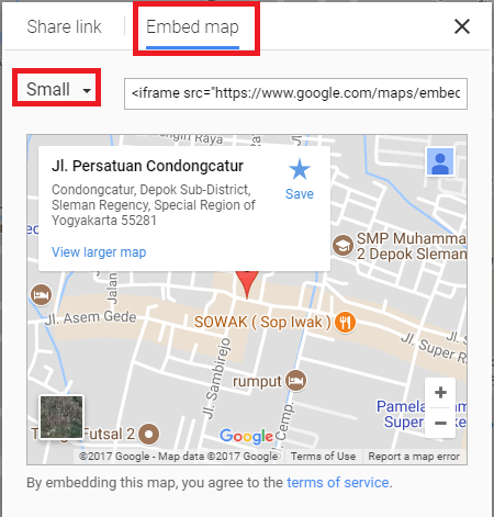 - Pilih Embed Map, anda dapat mengatur ukuran tampilan map (Small, Medium, Large, Custom Size)