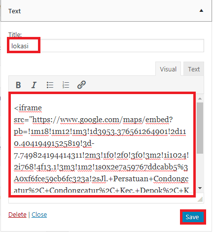- Lalu tempel(paste) kode <iframe..> yang sudah di salin dari google maps sebelumnya
