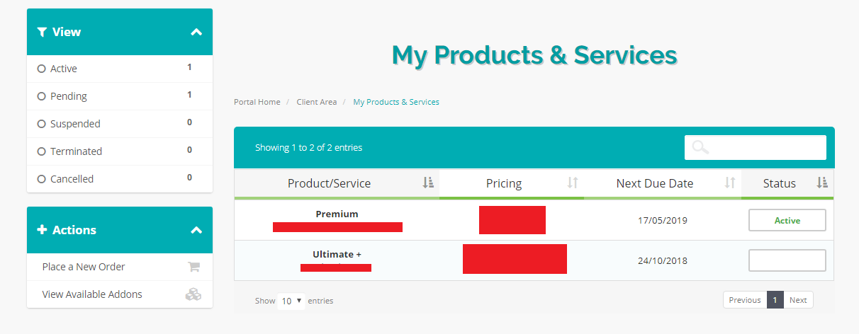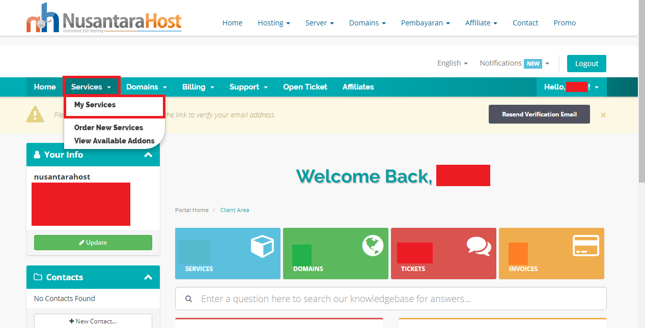 Setelah melakukan login maka setelahnya akan di arahkan ke halaman Client Area. Pada halaman ini Pengguna bisa melakukan pengelolaan terhadapan layanan yang telah di beli dari Nusantarahost. Untuk melakukan Upgrade langkah selanjutnya adalah memilih layanan yang akan di upgrade dengan cara