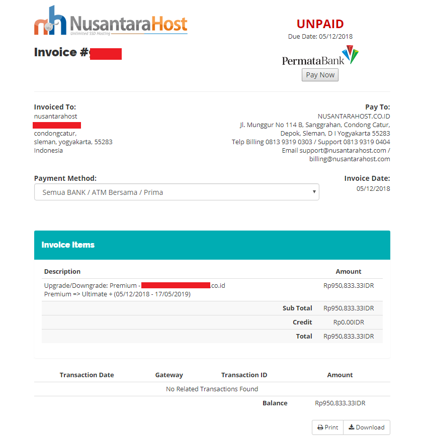 Setelah memperoleh invoice langkah selanjutnya adalah lakukan pembayaran sesuai dengan metode yang di pilih. Setelah pembayaran selesai maka proses upgrade akan segera di kerjakan oleh tim Nusantarahost.