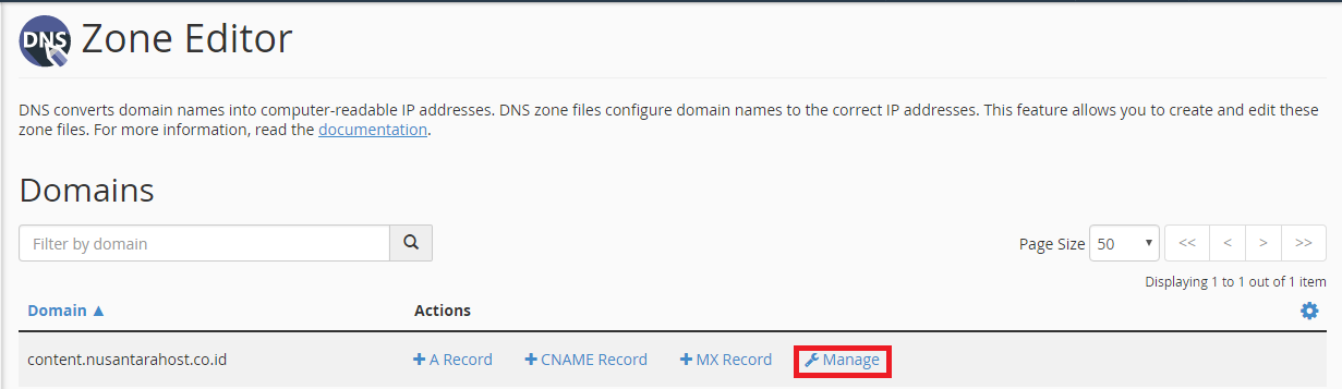 Setelahnya maka proses setting melalui cpanel telah selesai. Untuk melakukan pengecekan pada penambahan sebelumnya, Klik pilihan Manage.