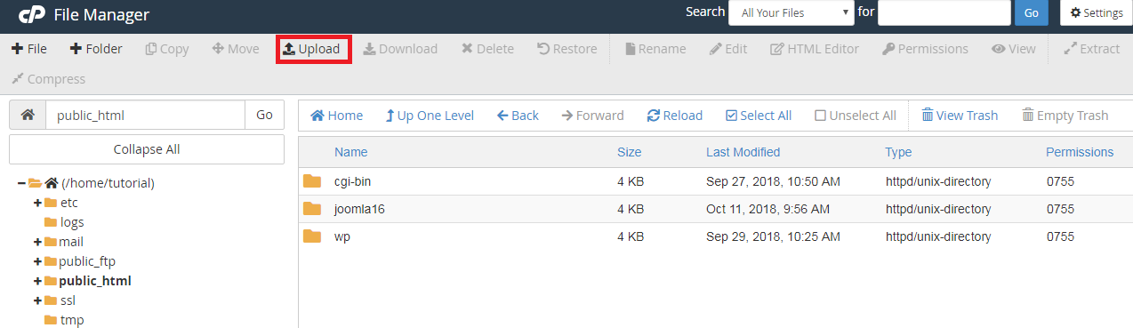 • Setelah itu klik Upload pada bagian toolbar yang terletak pada bagian atas halaman Public_html.